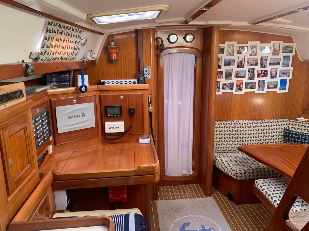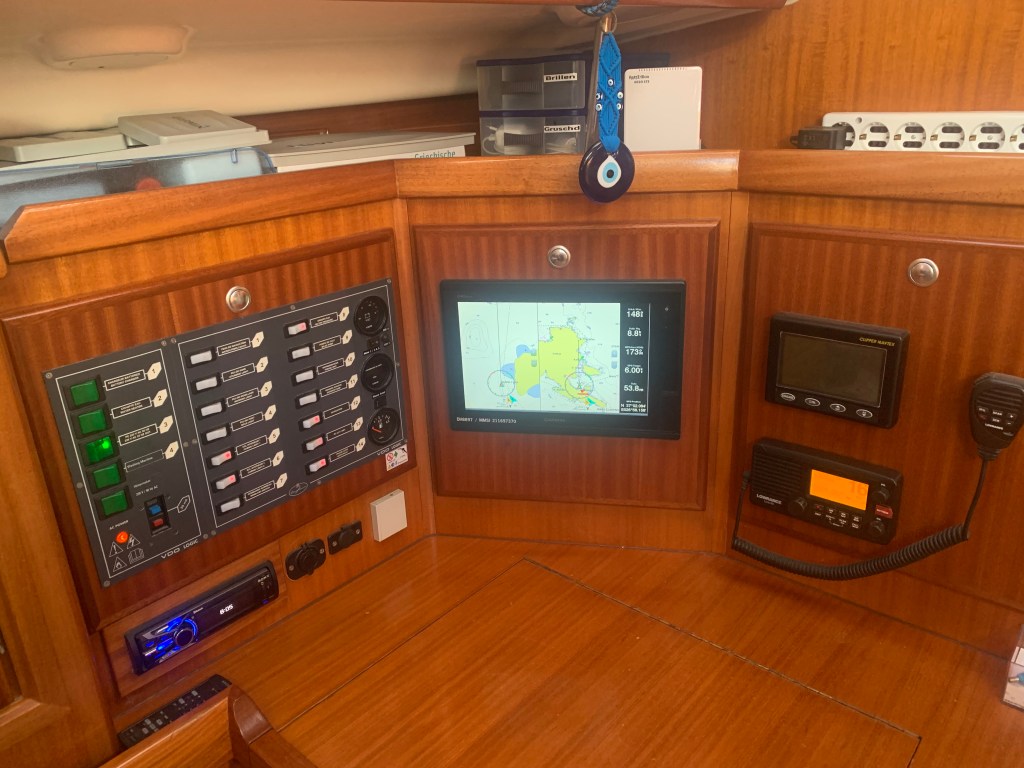 Geht man den Niedergang nach unten, dann steht man im Salonbereich. An Steuerbord befindet sich die umgebaute Salonsitzgruppe mit der „Technikecke“ (für Heizung und Waschmaschine), an Backbord ist ein vollwertiger und umfänglich ausgestatteter Navigationsplatz.