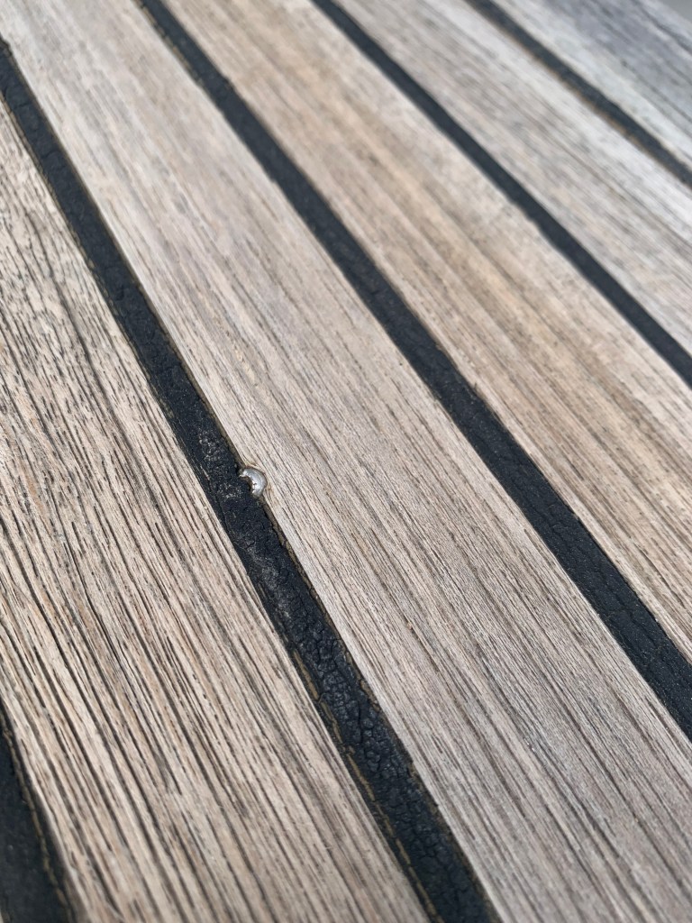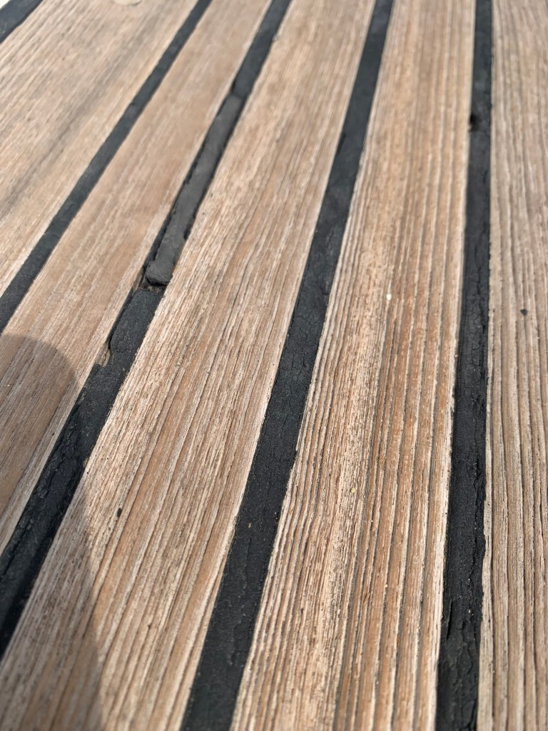 Als zeitnah zu erledigen ist das Teakdeck zu nennen. Es ist noch ok und kann aufgearbeitet werden. Das kann man selber machen oder in der Werft erledigen lassen. Es geht hierbei mehr um die Fugen, die sind nicht mehr in Ordnung.